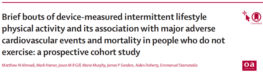 例如,2023年发表在《柳叶刀・公共卫生》的研究(基于英国生物银行25241名不运动成年人的8年随访数据)表明,即使是短暂的、非锻炼形式的中高强度间歇性生活方式身体活动(MV-ILPA),也能显著降低非锻炼人群的全因死亡率和主要不良心血管事件(MACE)风险。