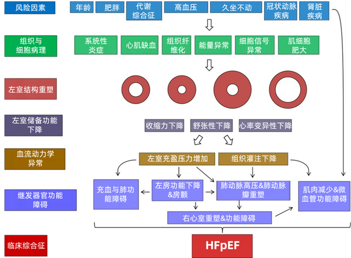 在过去的20年中,HFpEF的主要临床表型已经从单纯罹患高血压心脏病的老年人转移到患有肥胖症、糖尿病和代谢综合征的多病患者,将更多的注意力集中在全身炎症、内皮功能障碍、心肌能量学改变和骨骼肌异常上。