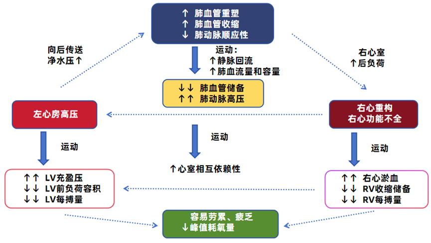 ①血流动力学机制:左心室充血/舒张功能不全/左心房高压,肺血管疾病/右心室功能障碍,血容量扩张及心脏变时功能不全。②分子机制:系统性微血管炎症,心脏代谢功能异常,细胞(肌联蛋白)/细胞外(脂肪、纤维化、淀粉样蛋白等)结构异常。