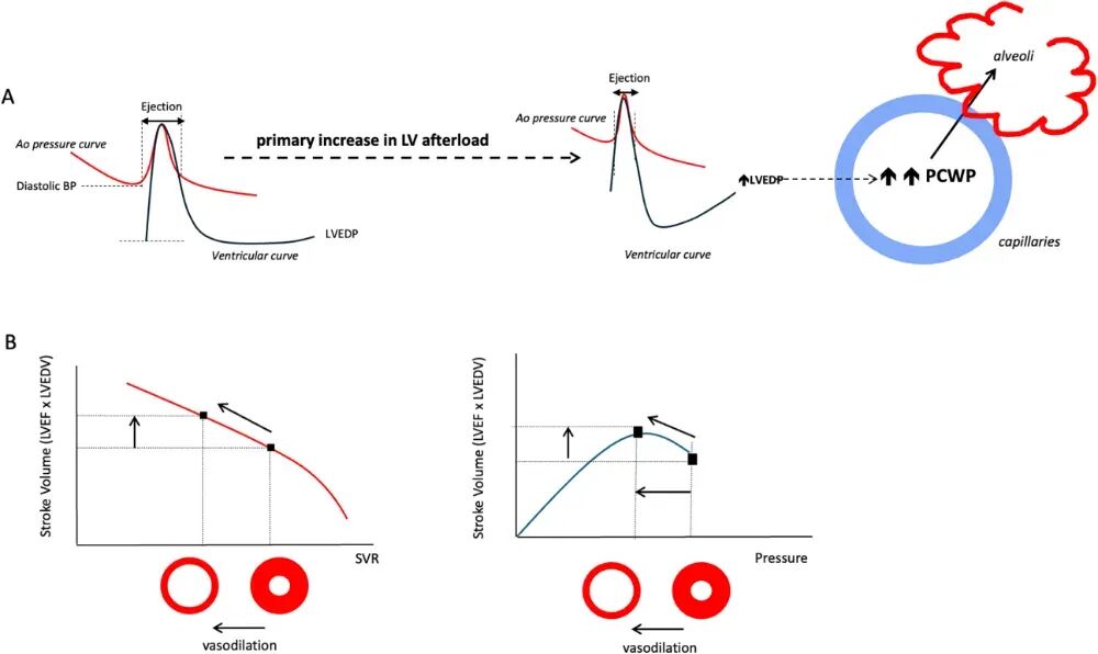 图1 急性心力衰竭中后负荷增加的血流动力学影响及血管扩张剂的治疗机制